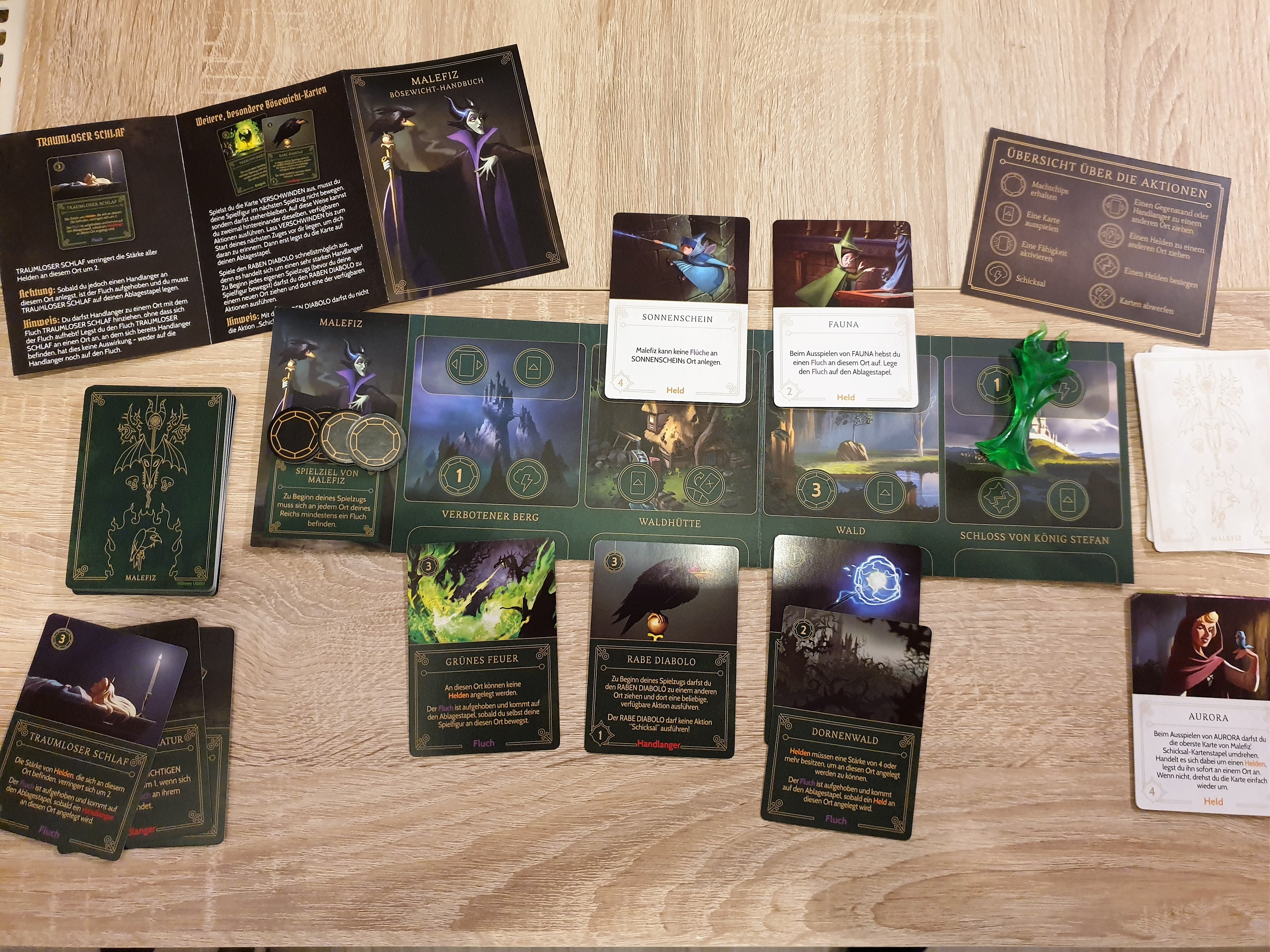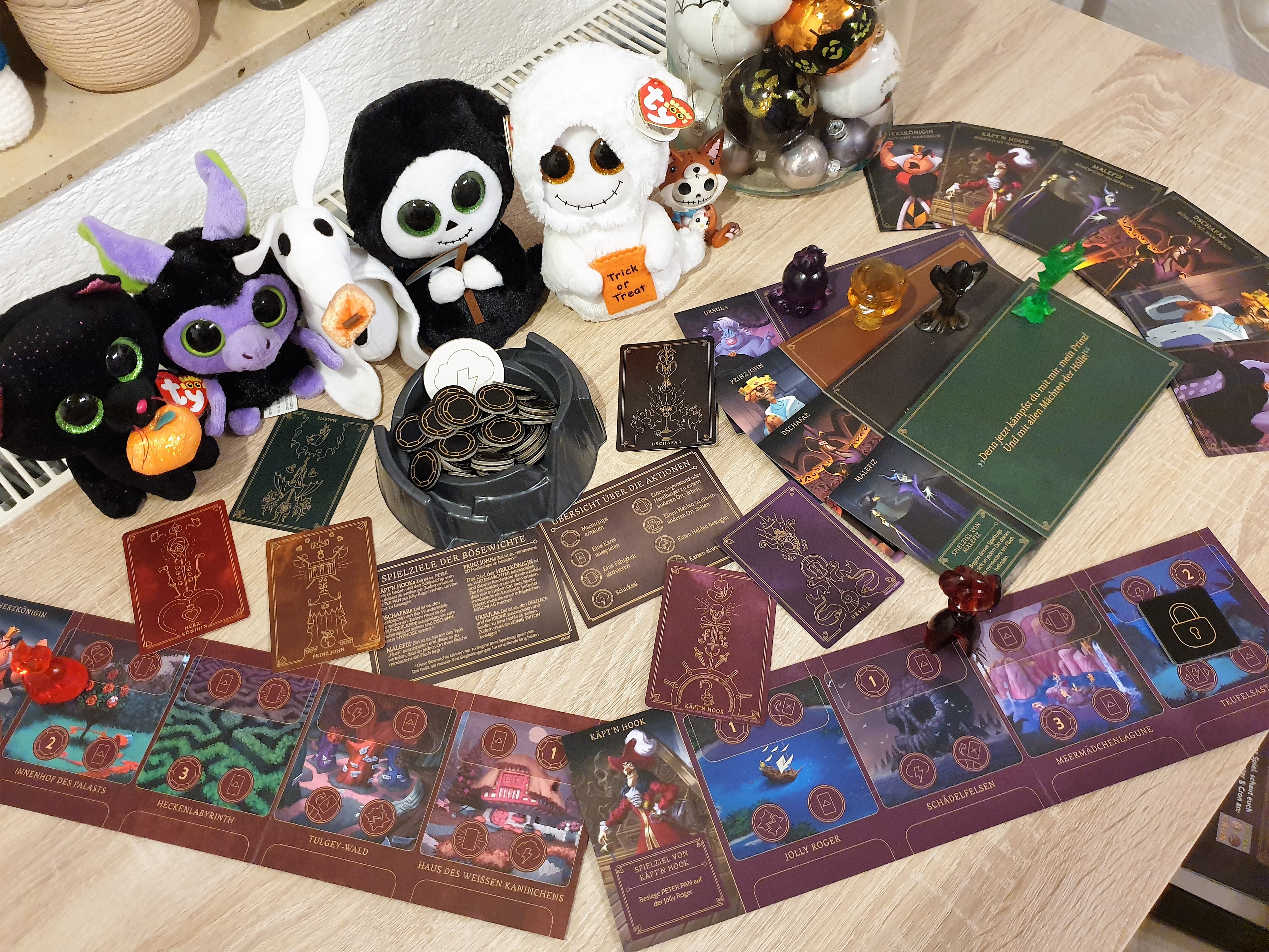 Das Spiel klingt zunächst furchtbar kompliziert und wir haben mehrere Anläufe gebraucht, um die Regeln zu verstehen. Aber sobald der Knoten einmal geplatzt ist, macht das Spiel wahnsinnig viel Spaß. Das liegt vor allem daran, dass es absolut liebevoll erstellt wurde und auch für jeden Schurken irgendwo einmalig ist. Denn auch wenn das Grundprinzip bei allen gleich ist, liegt es gerade an den einzelnen Zielen und den individuellen Karten, dass doch keine Partie der anderen gleicht. Klar sind manche Ziele etwas einfach zu verstehen, als bei anderen Schurken, aber irgendwo sind doch alle erreichbar. Auch Schurkentechnisch bietet bereits das Grundspiel eine gute Auswahl. Man hat hier Ursula (Arielle), Malefiz (Dornröschen), Dschafar (Aladdin), Die rote Königin (Alice im Wunderland), Captain Hook (Peter Pan) und Prinz John (Robin Hood) zur Auswahl. Außerdem gibt es bereits zwei Erweiterungspacks mit noch mehr Schurken.