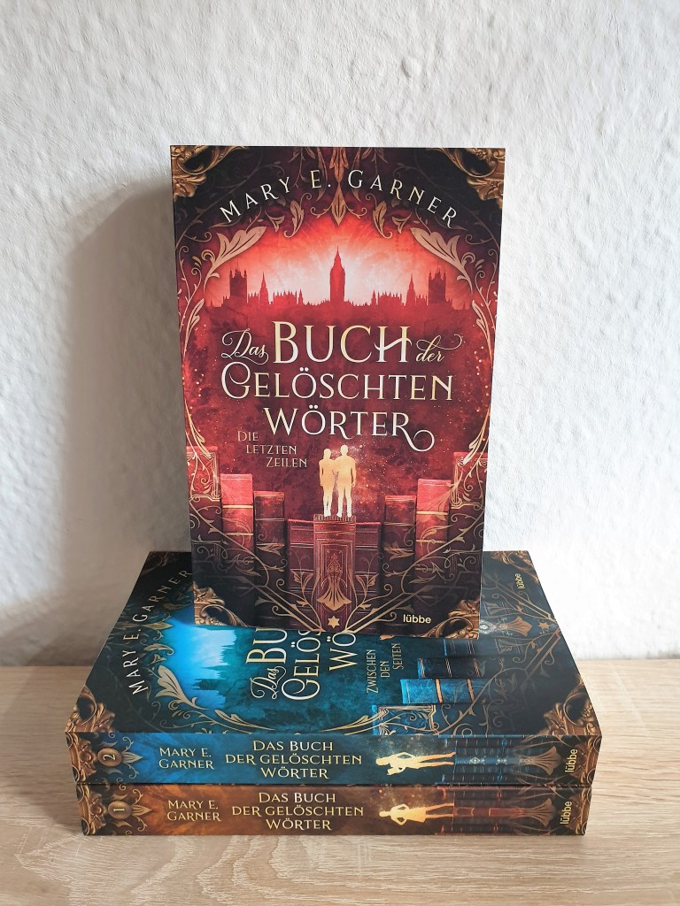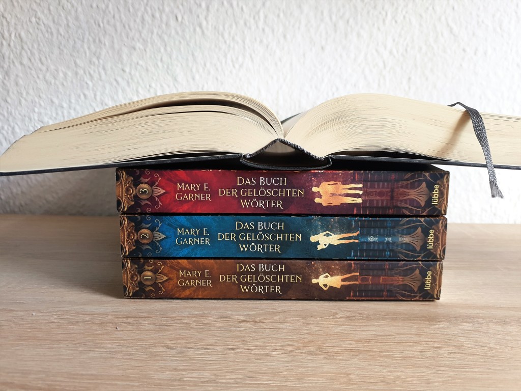 Bei den meisten Büchern im meinem Regal weiß ich ganz genau, warum ich sie mir gekauft habe. Sei es Empfehlungen von Freunden, Bloggern oder weil sie mir nach dem Kauf von anderen Büchern empfohlen wurden. Teilweise sind es auch einfach nur Neuerscheinungen von Autoren, die ich zuvor bereits mochte. Vielleicht ist mir ein Buch ins Auge gefallen, wenn ich in einem Buchladen stöbern war. Zu manchen Büchern könnte ich die Geschichte, wieso ich sie mir gekauft habt, stundenlang erzählen, weil sie so abgedreht ist. Und dann gibt es die Bücher, die mir einfach durch Zufall in die Hände fielen. So erging es mir mit dem ersten Band der Reihe „Das Buch der gelöschten Wörter“. Dann klang die Geschichte auch noch interessant. Aber schon nach der Hälfte des ersten Bands wusste ich es. Dies ist eine Reihe, die ich nicht mehr so schnell aus der Hand legen konnte und die mich noch eine ganze Weile beschäftigen wird. – Dieser Beitrag wird versucht spoilerfrei zu halten, so dass die Handlungsübersichten der Folgebände vielleicht an ein paar Stellen etwas schwammig wirken können. So kann auch von allen, die die Bücher erst noch lesen wollen, dieser Beitrag vollständig gelesen werden.