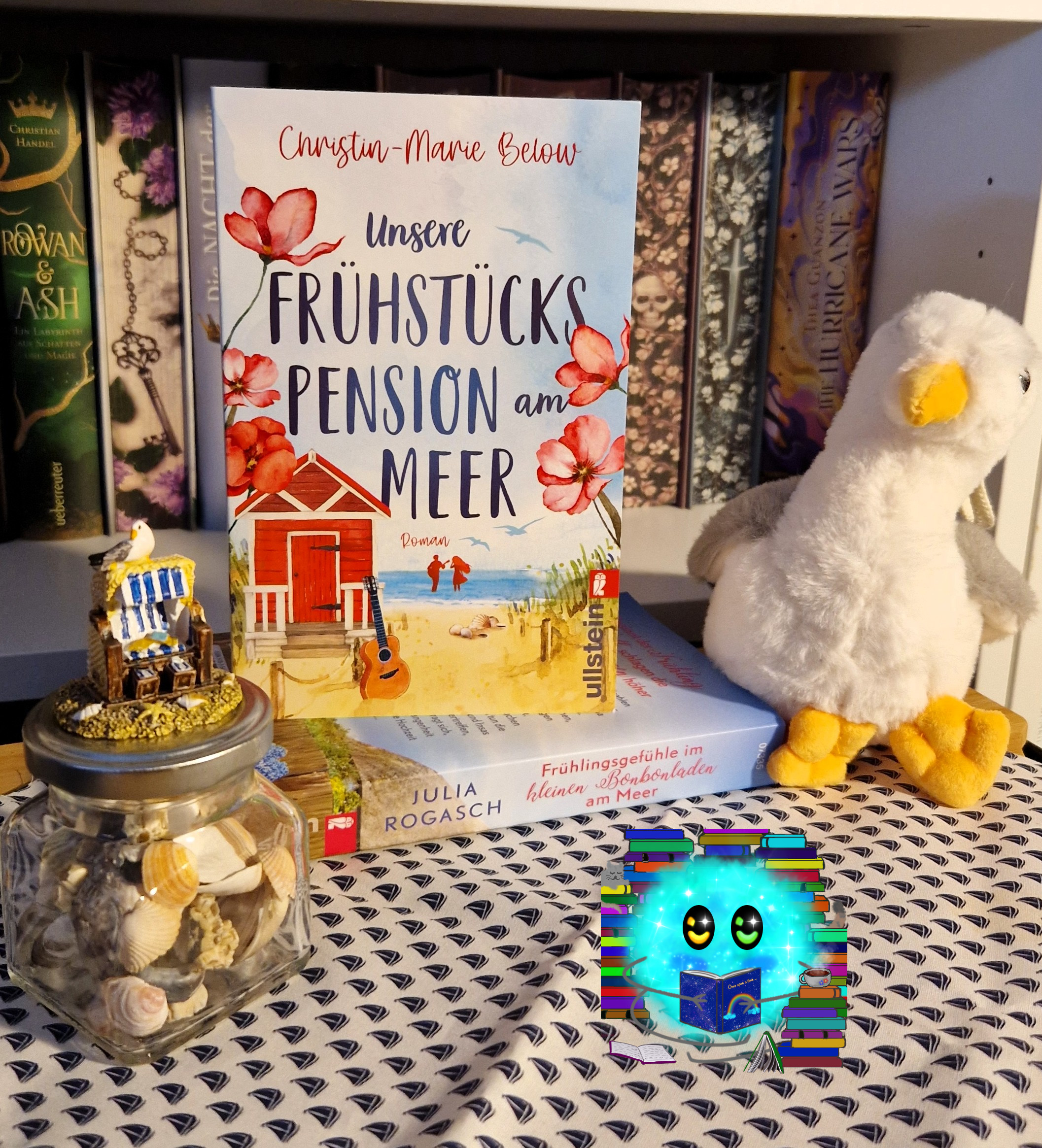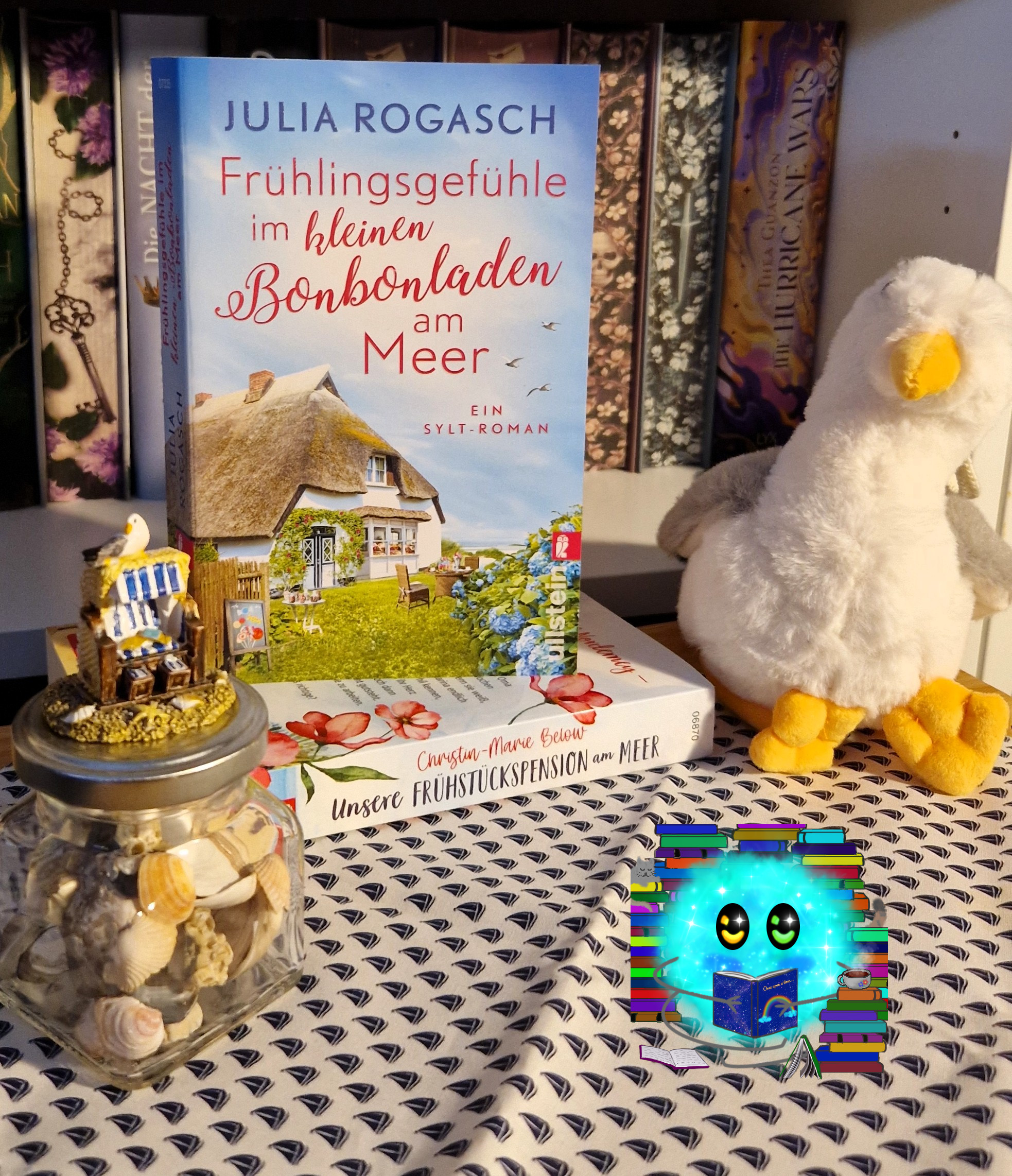 Die beiden Bücher arrangiert mit Möweplüsh, Muschelglas und kleine Figur eines Strandkorbs
